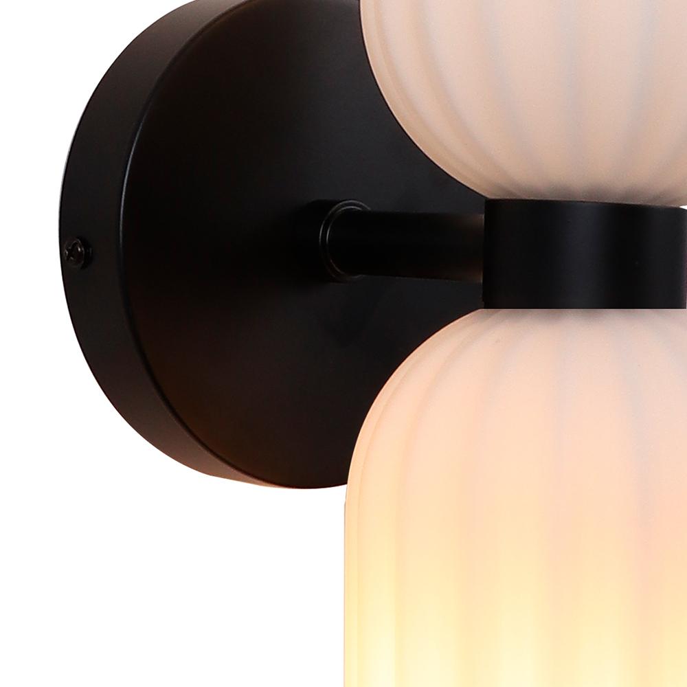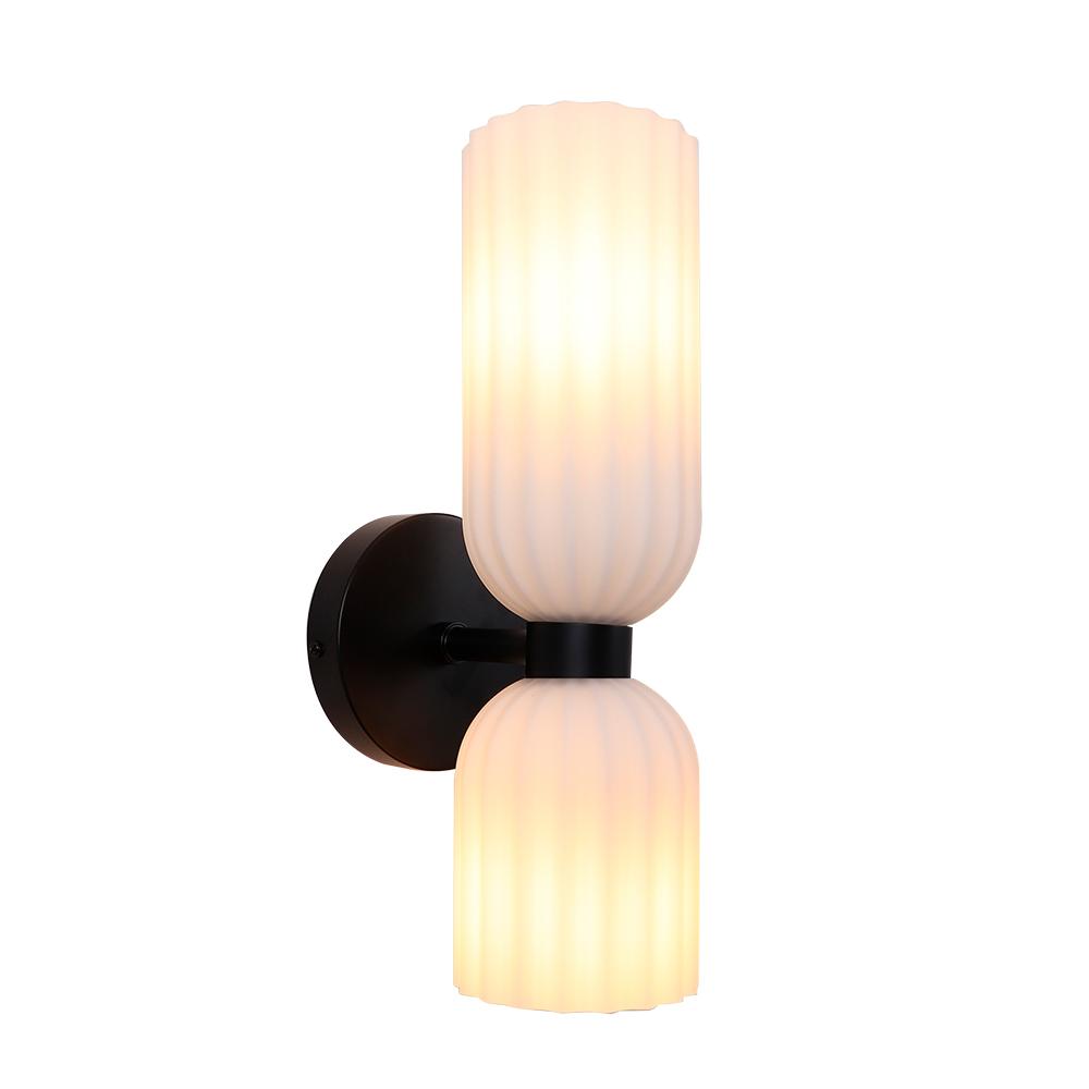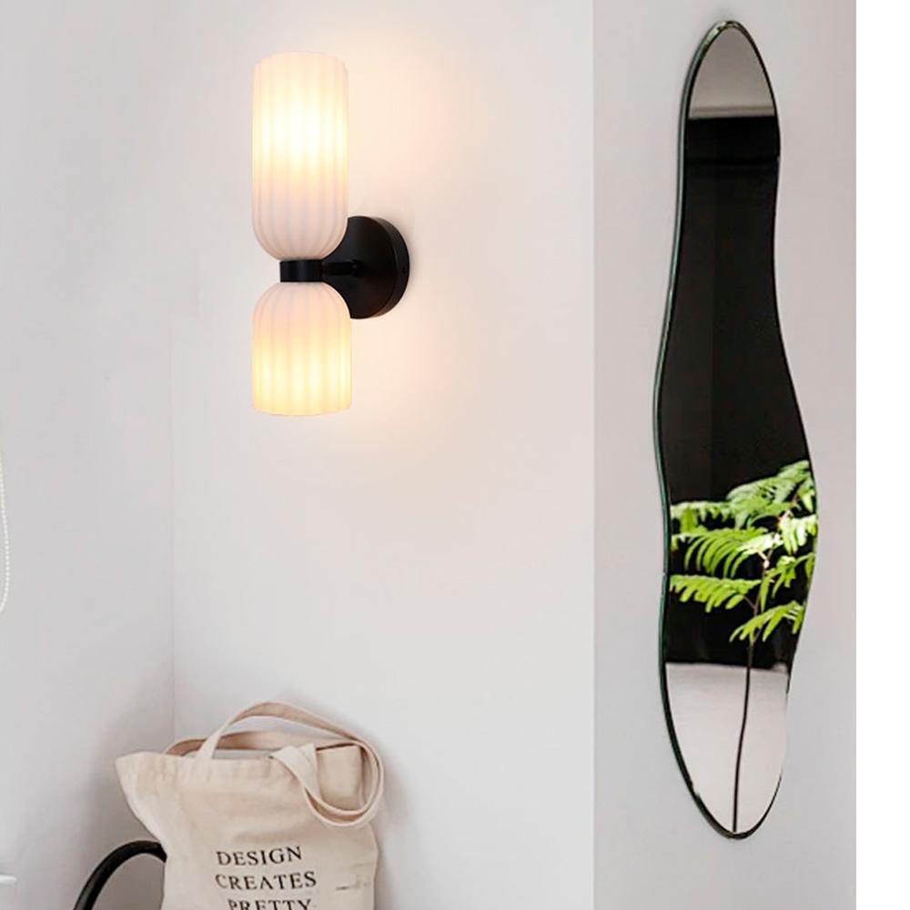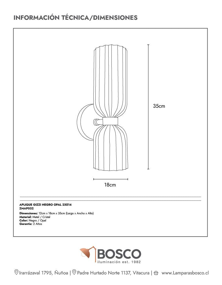 Diseño vintage con un giro elegante. El aplique Gizzi combina vidrio texturizado en tono opal con detalles negros para crear una luz cálida y envolvente. Ideal para pasillos, dormitorios o rincones acogedores que buscan un toque de sofisticación con personalidad retro. Compatible con 2 ampolletas E14.