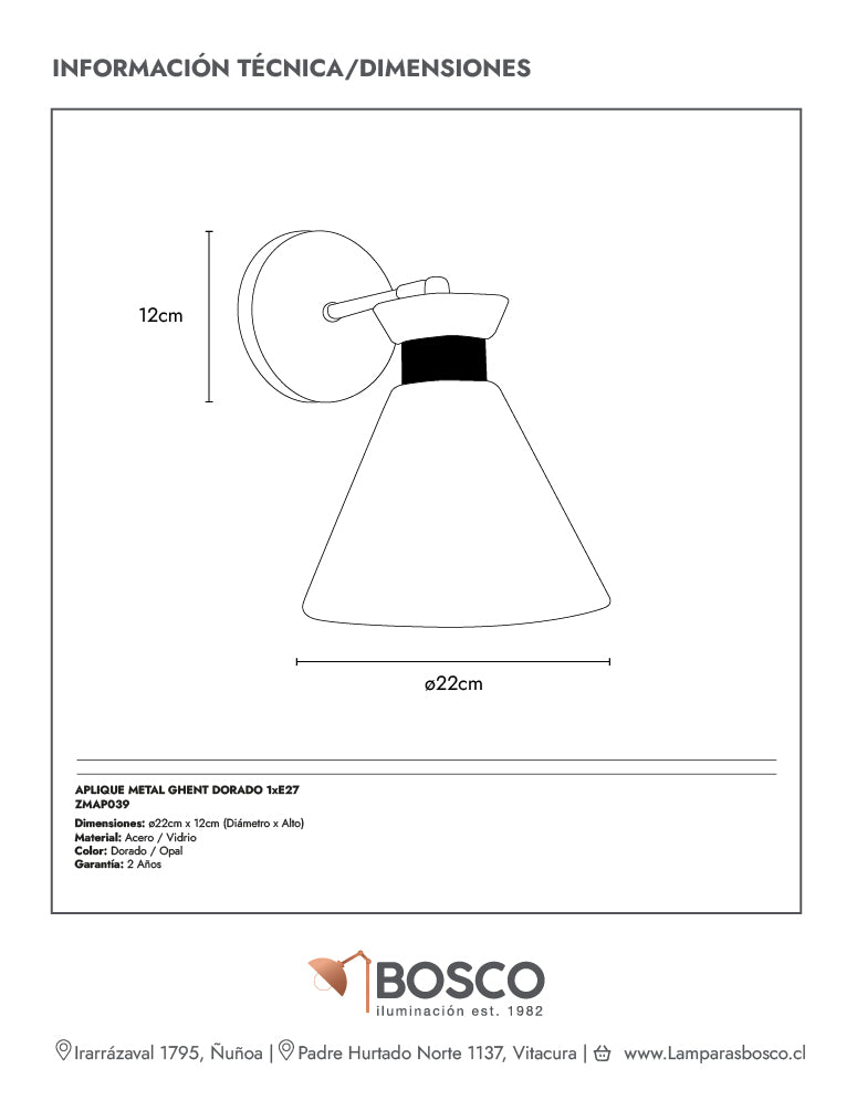 Con un diseño limpio y contemporáneo, este aplique destaca por su estructura metálica de color Dorado y pantalla de vidrio opal, que emite una luz cálida y envolvente. Ideal para pasillos, baños o como luz de acento, aporta un toque sofisticado sin sobrecargar el ambiente.