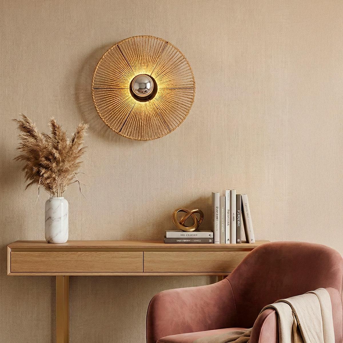 La iluminación también puede aportar textura y calidez al espacio. El Aplique Riva, elaborado en fibra trenzada, proyecta una luz suave que dibuja sutiles juegos de sombra sobre el muro. Su formato circular y natural crea un punto decorativo ideal para livings, dormitorios o espacios con inspiración orgánica. Funciona con ampolleta E27, perfecto para generar ambientes acogedores y llenos de carácter.
