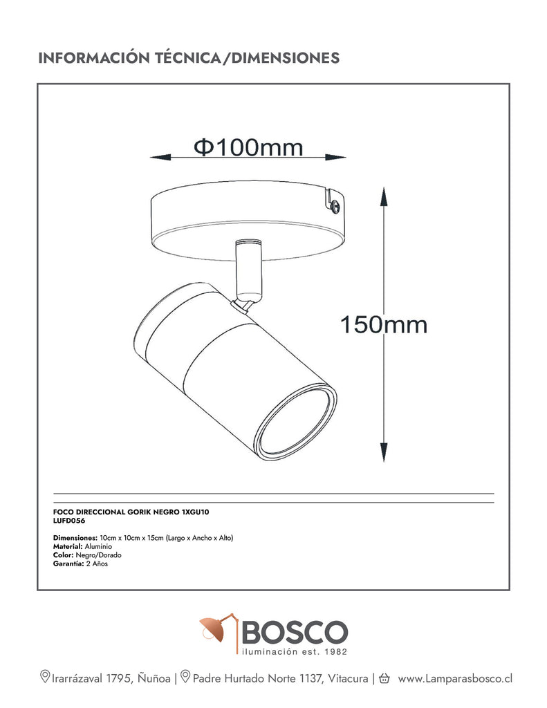 El foco de techo Gorik combina un diseño contemporáneo con una funcionalidad versátil. Con sus dimensiones compactas de 10 cm de largo, 10 cm de ancho y 15 cm de alto, se adapta perfectamente a espacios modernos. Su marco de metal con acabado negro mate y detalles en oro/messing mate irradia elegancia. Gracias a su cabeza ajustable y su función giratoria e inclinable, ofrece iluminación focalizada o ambiente cálido. Compatible con ampolletas LED GU10 y regulable (no incluido), Gorik es ideal para tu sala de estar, cocina o pasillo. ¡Estilo y funcionalidad en un solo producto!