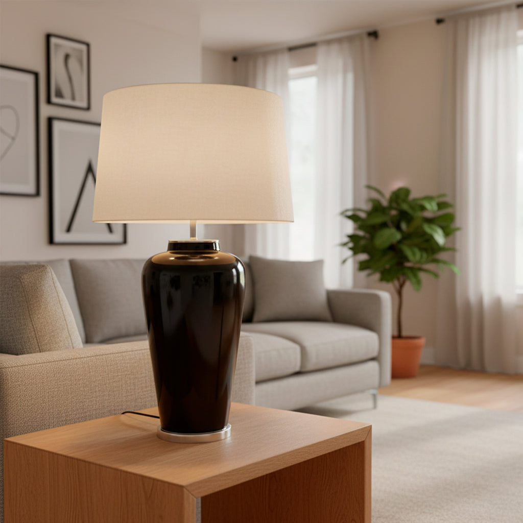 Elegancia y carácter se fusionan en la lámpara de cerámica Jarrón Negro, una pieza que destaca por su diseño sofisticado y su acabado mate. Su base de cerámica con forma de jarrón aporta un toque artístico y atemporal, convirtiéndola en el complemento ideal para espacios que buscan equilibrio entre modernidad y calidez. Perfecta para salones, dormitorios o rincones de lectura, su luz suave y envolvente crea una atmósfera acogedora en cualquier ambiente.