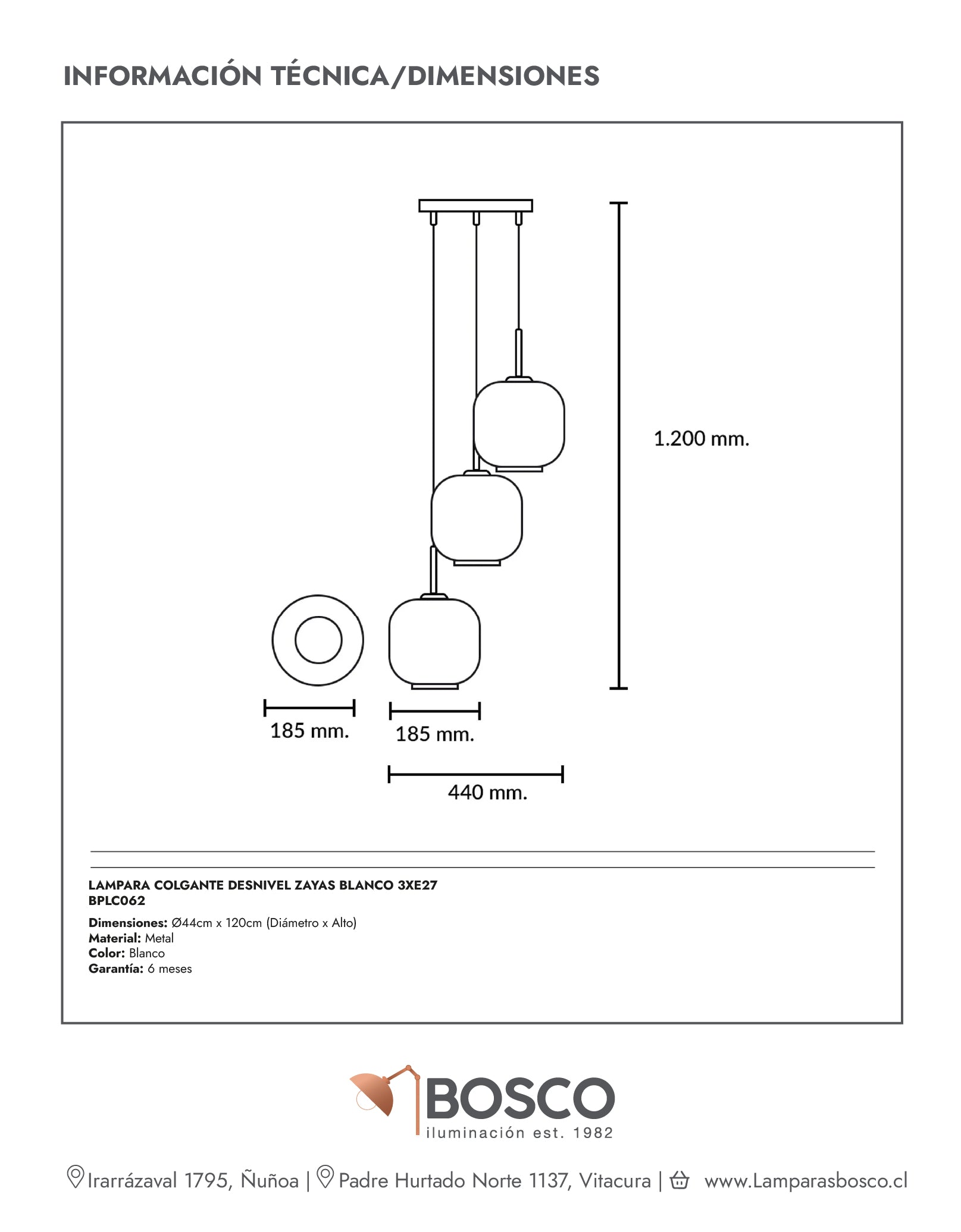 LAMPARA COLGANTE DESNIVEL ZAYAS BLANCO 3XE27
