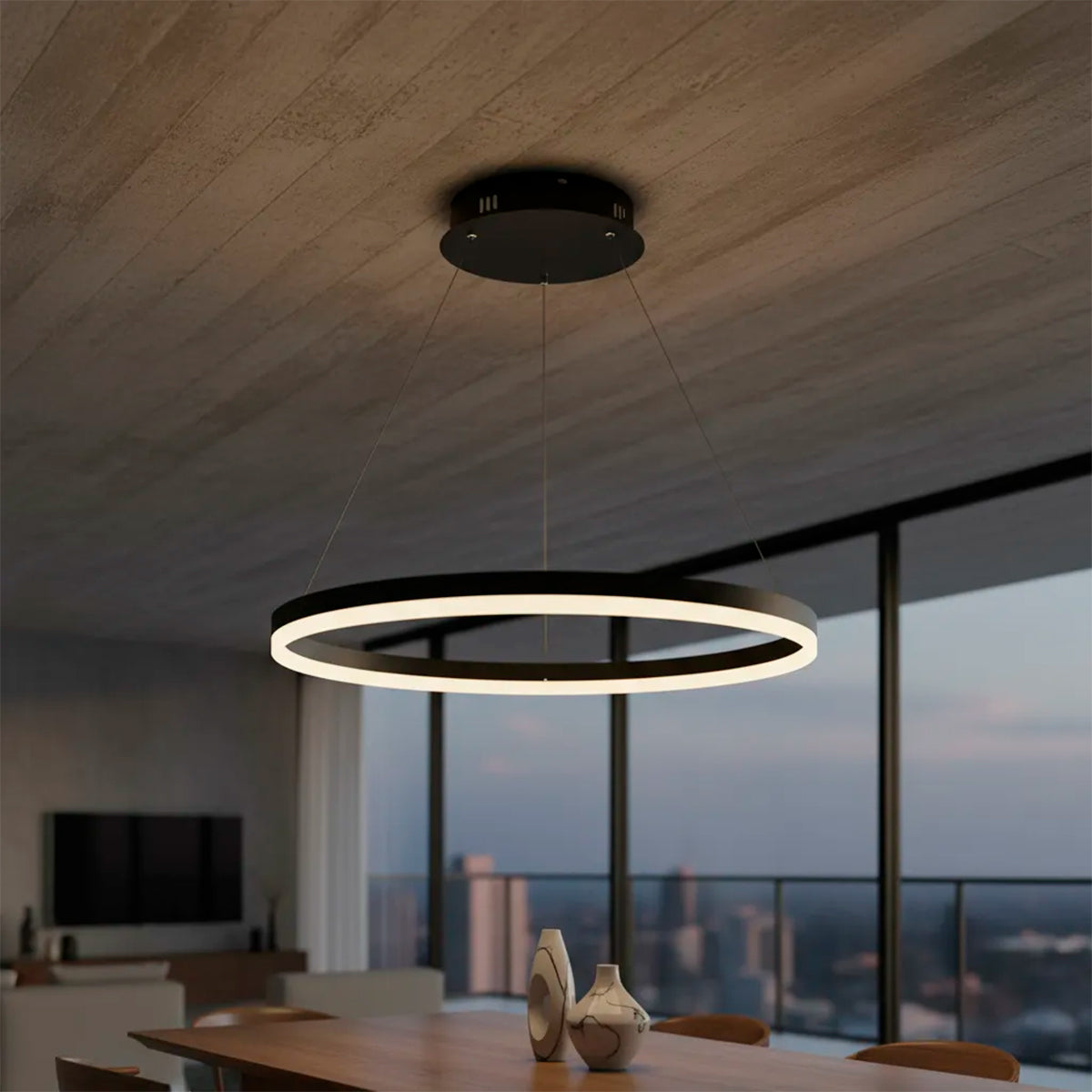 La lámpara colgante LED redonda de 30W combina diseño minimalista y eficiencia lumínica. Su aro de 50 cm en acabado negro emite una luz cálida envolvente, ideal para crear ambientes acogedores y modernos en livings, comedores o espacios de trabajo.