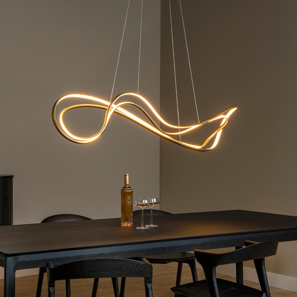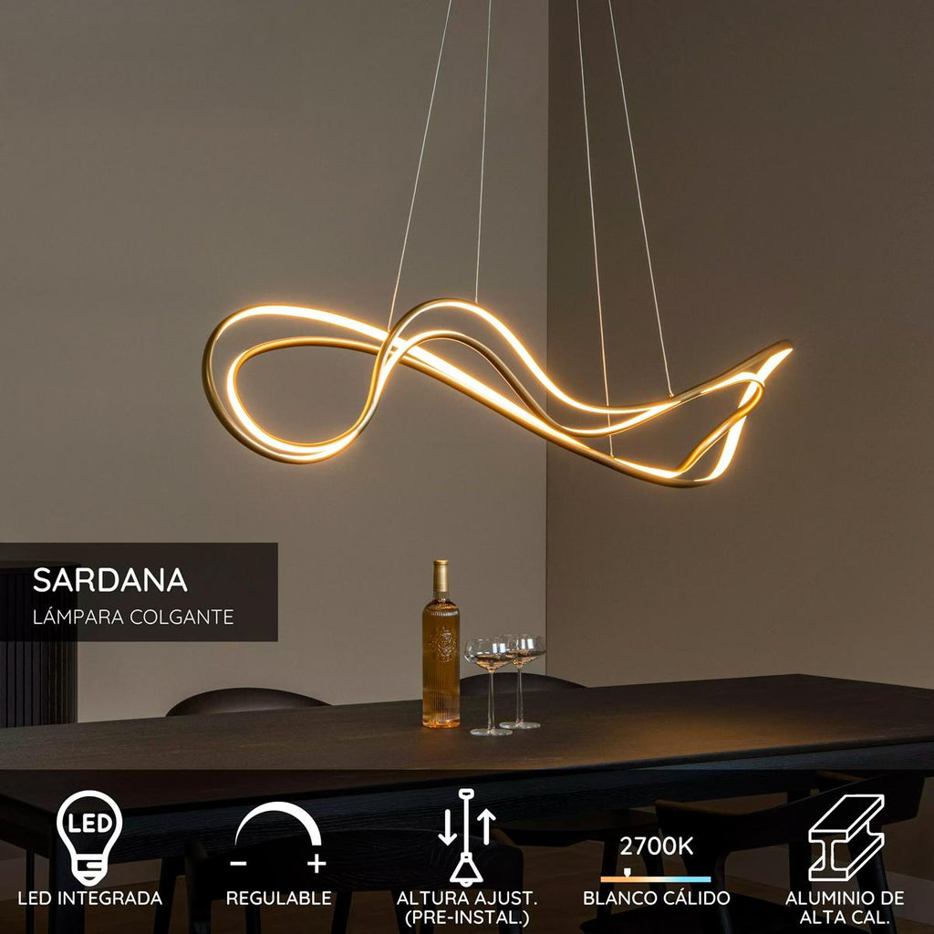 La Lámpara Colgante Sardana es una obra de arte lumínica que transforma cualquier interior moderno en un espacio de lujo. Esta lámpara se caracteriza por su diseño elegante, sus formas orgánicas y su impresionante longitud de 160 cm, ideal para coronar grandes mesas de comedor, islas o barras de cocina.
