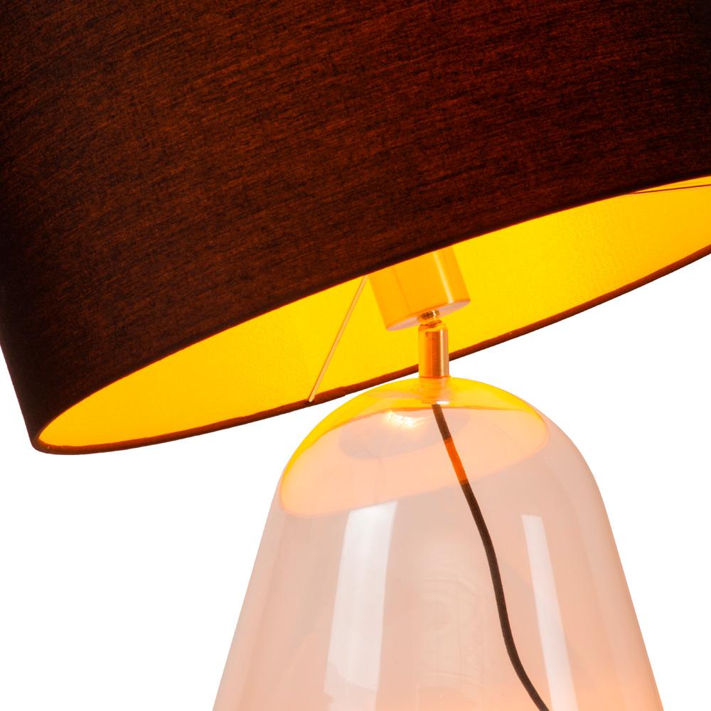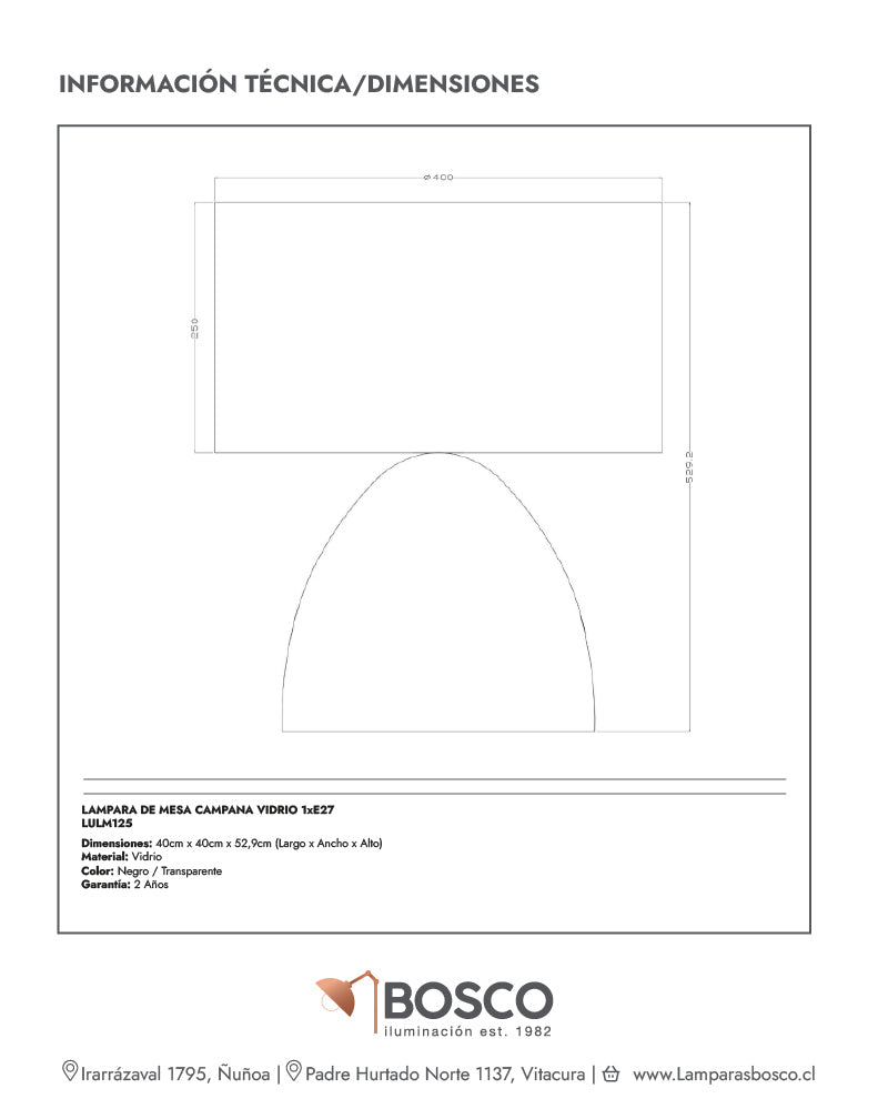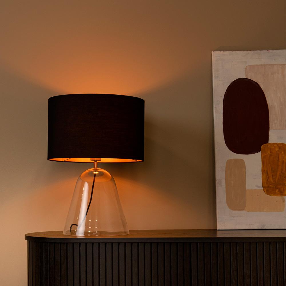 Belleza natural: un clásico con toque contemporáneo. La Campana destaca por su base cónica de vidrio cristal claro y su pantalla cilíndrica inclinable forrada en tela negra con interior dorado. Combina materiales nobles y un diseño elegante que decoradores e interioristas valoran por su versatilidad en estilos Japandi, escandinavo o moderno. Ideal en living, velador o escritorio.