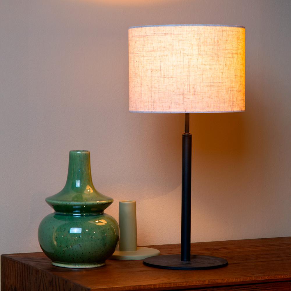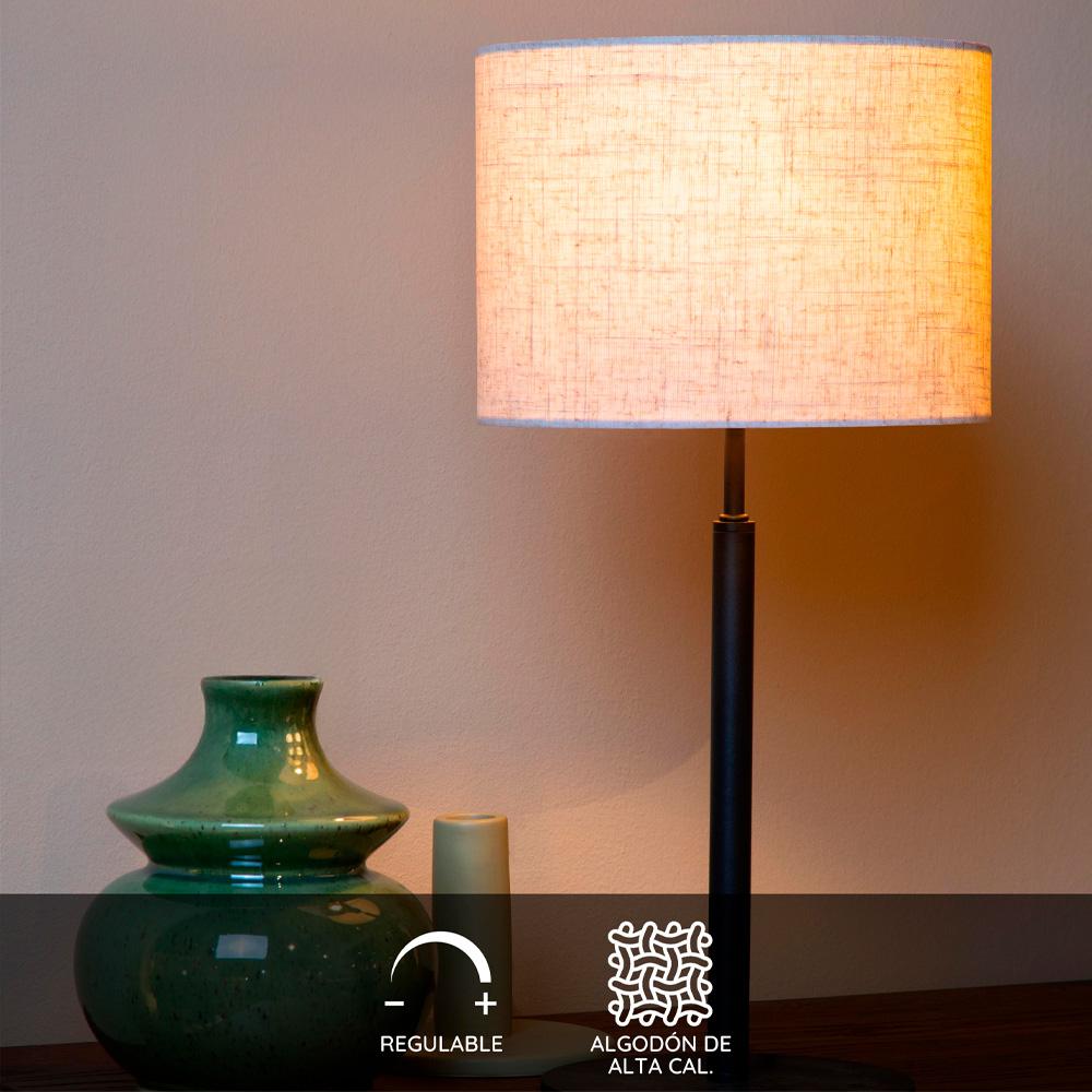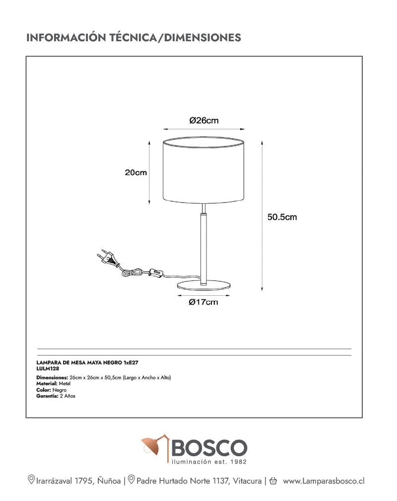 La lámpara Maya combina una base metálica negra con pantalla de algodón, creando una fuente de luz suave y difusa. Su diseño atemporal y minimalista la hace perfecta para mesas de living, veladores o escritorios, aportando un ambiente acogedor y sofisticado valorado por decoradores e interioristas.