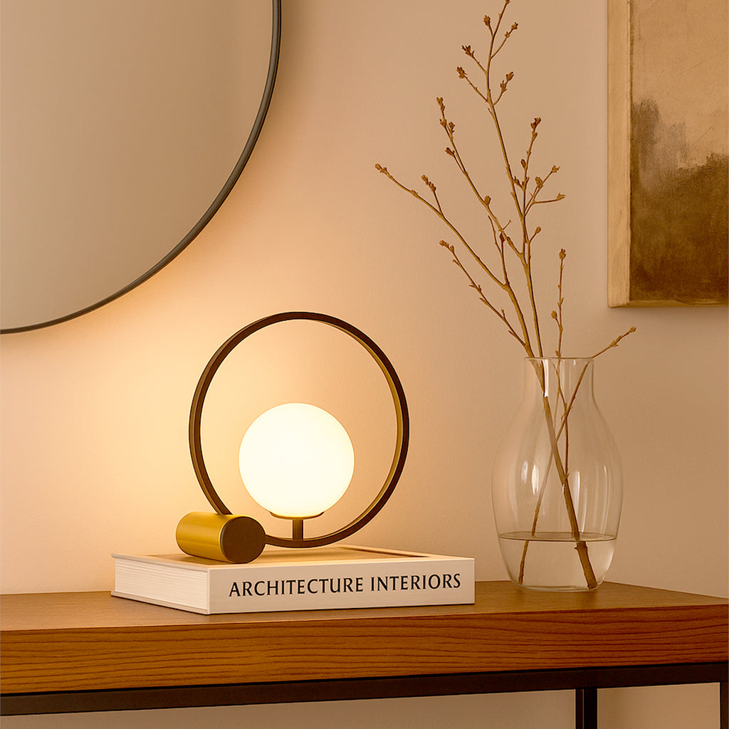 Imagina una esfera de luz dentro de un círculo metálico que abraza la forma, generando una presencia elegante y minimalista. Así es la lámpara de mesa Neso: una pieza escultórica que aporta sofisticación y calidez a dormitorios, escritorios o rincones de lectura.