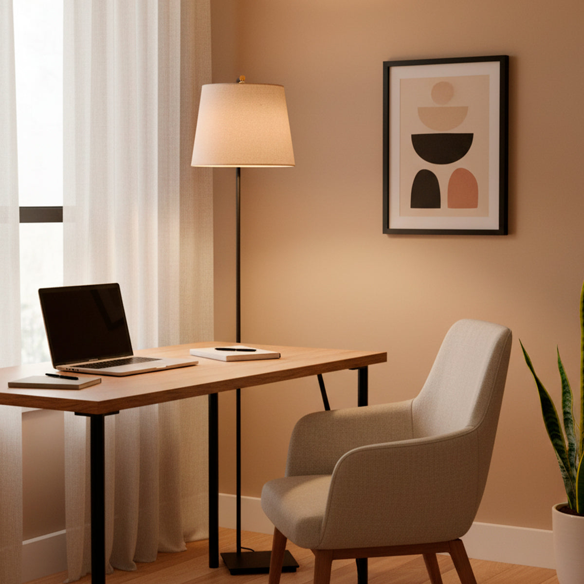 Con un diseño estilizado y elegante, la lámpara de pie Ele aporta calidez y carácter a cualquier espacio. Su estructura metálica en tono negros y bronce combina con una pantalla textil color cuero que suaviza la luz y crea un ambiente acogedor. Ideal para el living, un rincón de lectura o junto a un sillón, su diseño clásico con un toque moderno se adapta a distintos estilos de decoración. Funciona con una ampolleta E27 (no incluida).