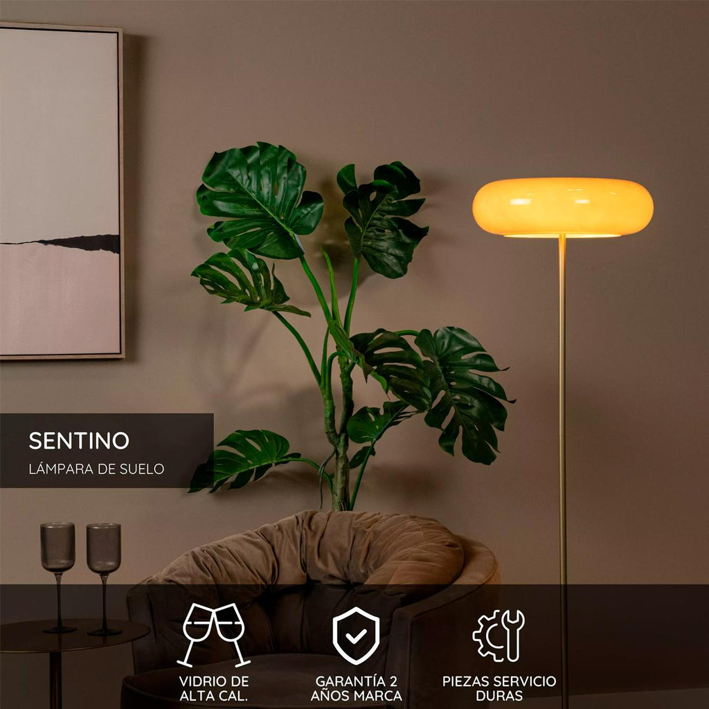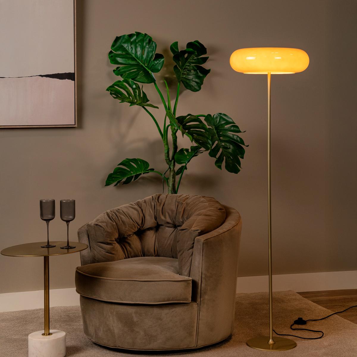 Con su imponente altura de 150 cm y un disco de vidrio brillante en forma de "donut" (Ø 40 cm), esta pieza central atraerá todas las miradas. El color taupe neutro se complementa a la perfección con el elegante acento en oro mate/latón de la base, asegurando que Sentino encaje en decoraciones Clásicas, Modernas o incluso Nórdicas que necesiten un punto focal.