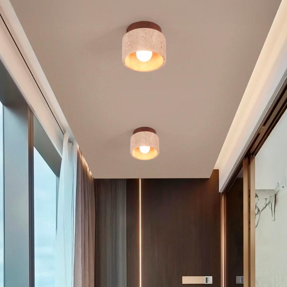Esta luminaria combina la calidez de la piedra travertino con un diseño minimalista de inspiración japonesa. Su forma orgánica y líneas suaves aportan un aire elegante y sereno, ideal para entradas, pasillos o espacios comunes donde se busca iluminar con estilo. El tono amarillo suave difumina la luz de manera cálida, creando atmósferas acogedoras sin sobrecargar el espacio. Una pieza perfecta para quienes buscan algo distinto, moderno y con presencia natural.