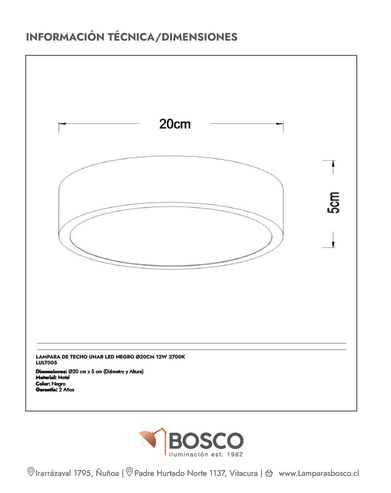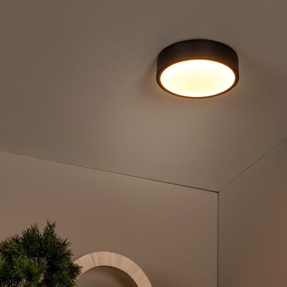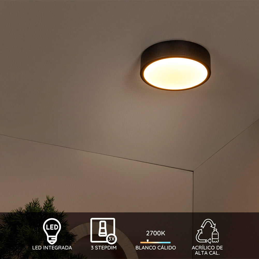 La Unar es una luminaria de techo tipo plafón ideal para espacios donde la simplicidad y la funcionalidad marcan la diferencia. Su estructura circular de 20 cm de diámetro, perfil bajo y acabado negro + difusor acrílico opal armoniza en cualquier ambiente: pasillos, baños, dormitorios, cocinas o salas de estar. Con un sistema LED integrado y regulación en 3 pasos vía interruptor de pared, ofrece una comodidad real: luz cálida a la intensidad que prefieras para cada momento del día
