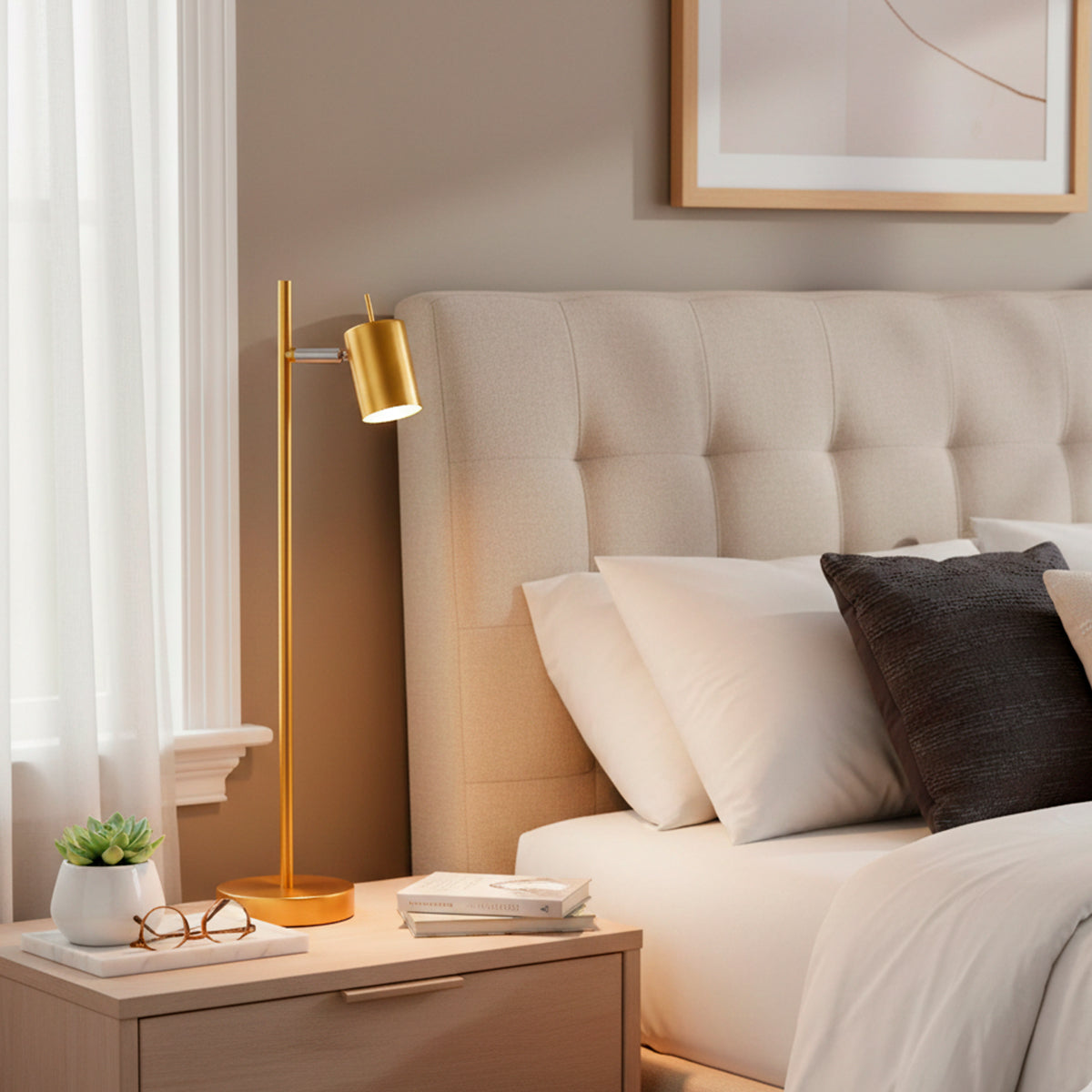 Con un diseño depurado y contemporáneo, la lámpara Kardon de sobremesa en color dorado es la pieza perfecta para quienes buscan una iluminación sofisticada y funcional. Su estructura de líneas limpias y su acabado en tono neutro permiten integrarla fácilmente en cualquier ambiente, desde espacios modernos hasta decoraciones más clásicas.