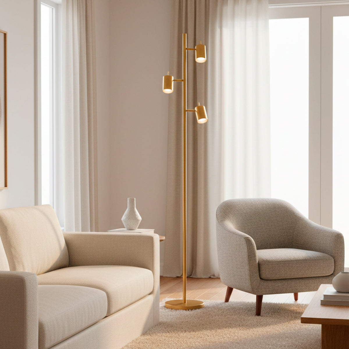 La lámpara de pie Kardon Gold aporta un toque glamoroso y moderno a cualquier ambiente. Su estructura dorada y sus tres puntos de luz orientables permiten iluminar de forma funcional y decorativa espacios como livings, salas de estar o rincones de lectura. Compatible con ampolletas GU10 (no incluidas), es perfecta para destacar con estilo.
